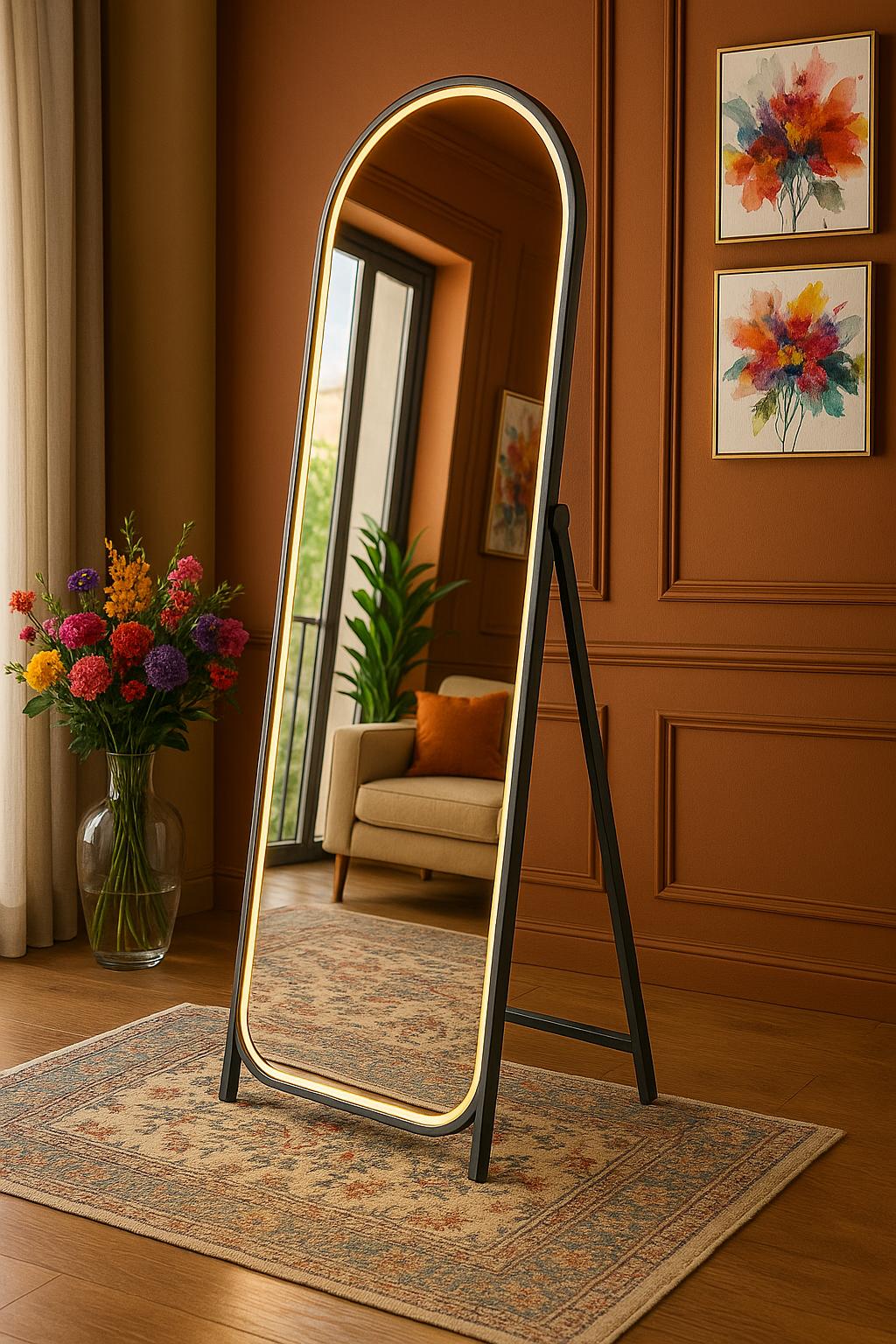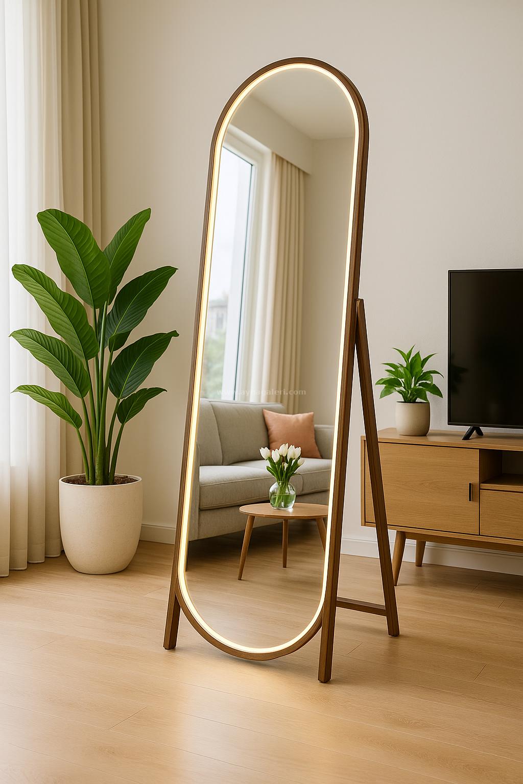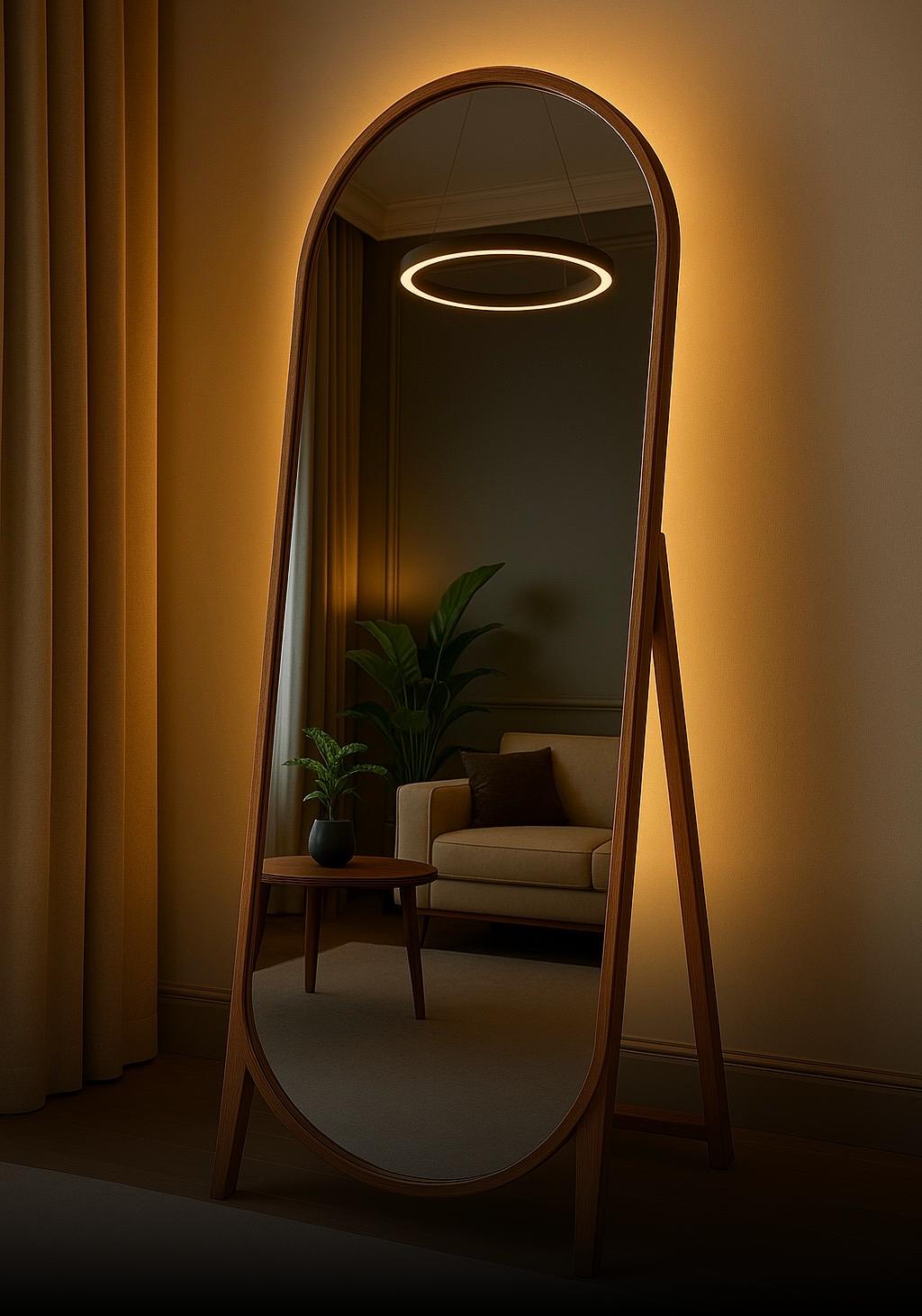Doğallığı ve modern detayları bir arada sunan Natürel Ahşap Ayaklı Köşe Işıklı Boy Aynası, 180 cm x 60 cm ölçüsüyle baştan ayağa tam görüş sağlar. Ahşabın sıcak tonları, LED aydınlatma teknolojisiyle birleşerek hem dekoratif hem işlevsel bir kullanım sunar.