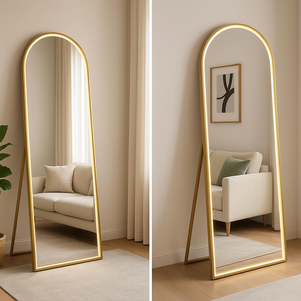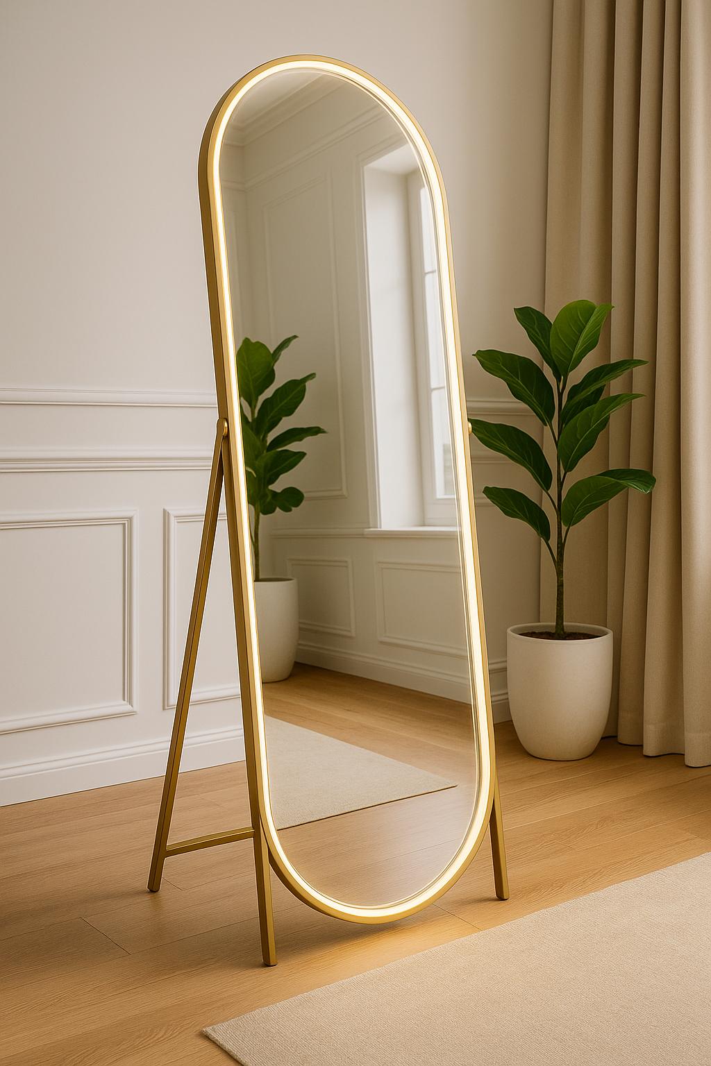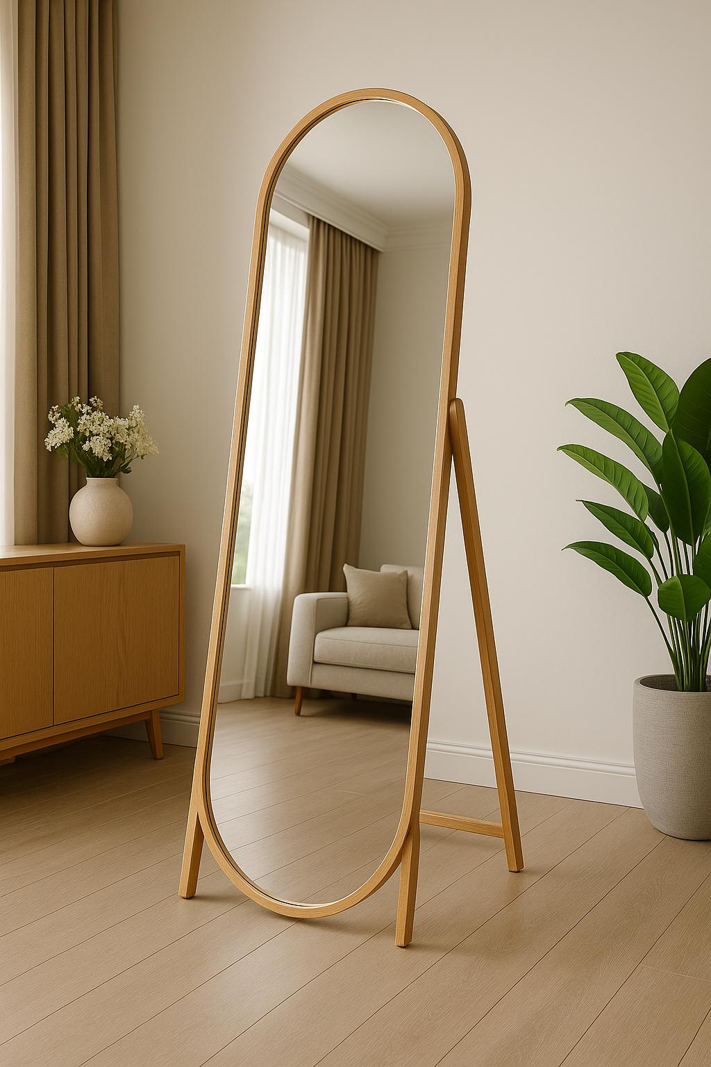 Doğallığı ve modern detayları bir arada sunan Natürel Ahşap Ayaklı Köşe Işıklı Boy Aynası, 180 cm x 60 cm ölçüsüyle baştan ayağa tam görüş sağlar. Ahşabın sıcak tonları, LED aydınlatma teknolojisiyle birleşerek hem dekoratif hem işlevsel bir kullanım sunar.
