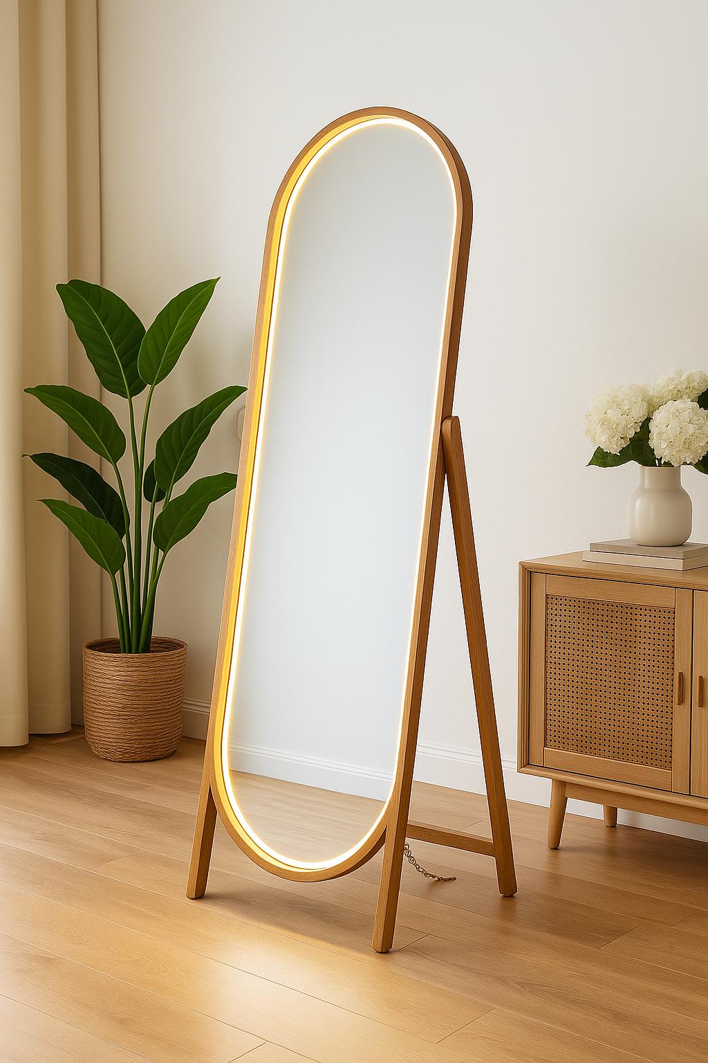 Natürel Ahşap Ayaklı Köşe Işıklı Boy Aynası 180 x 60cm